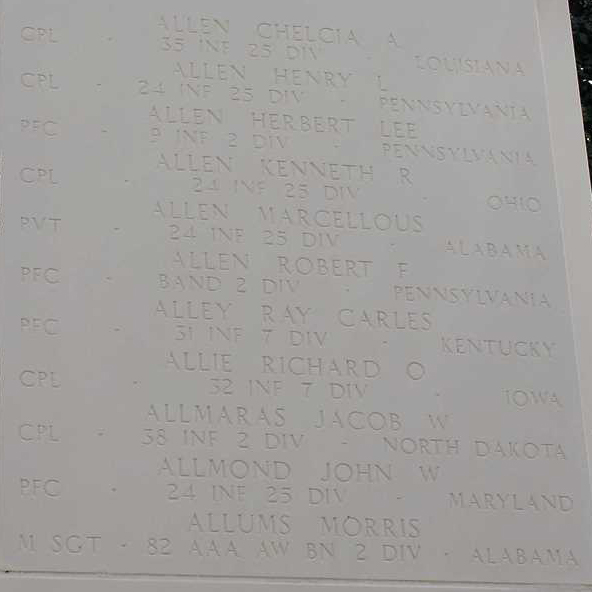 Pvt Allen was listed as Missing in Action while fighting the enemy in Korea on September 30, 1951. He was presumed dead on February 15, 1954. His remains were not recovered. His name is inscribed on the Courts of the Missing at the Honolulu Memorial.