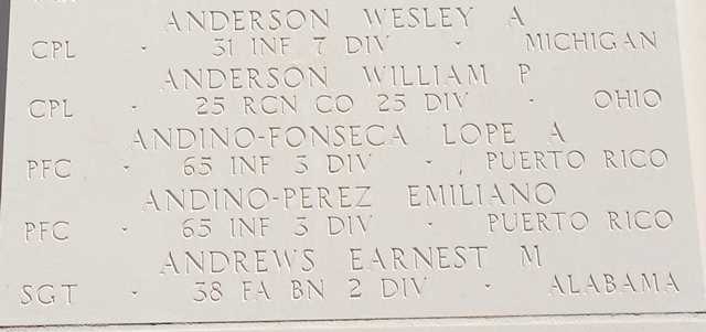 Sgt Andrews was Killed in Action on November 30, 1950, during the Battle of Chosin Reservoir in North Korea. His remains were not recovered. His name is inscribed on the Courts of the Missing at the Honolulu Memorial.