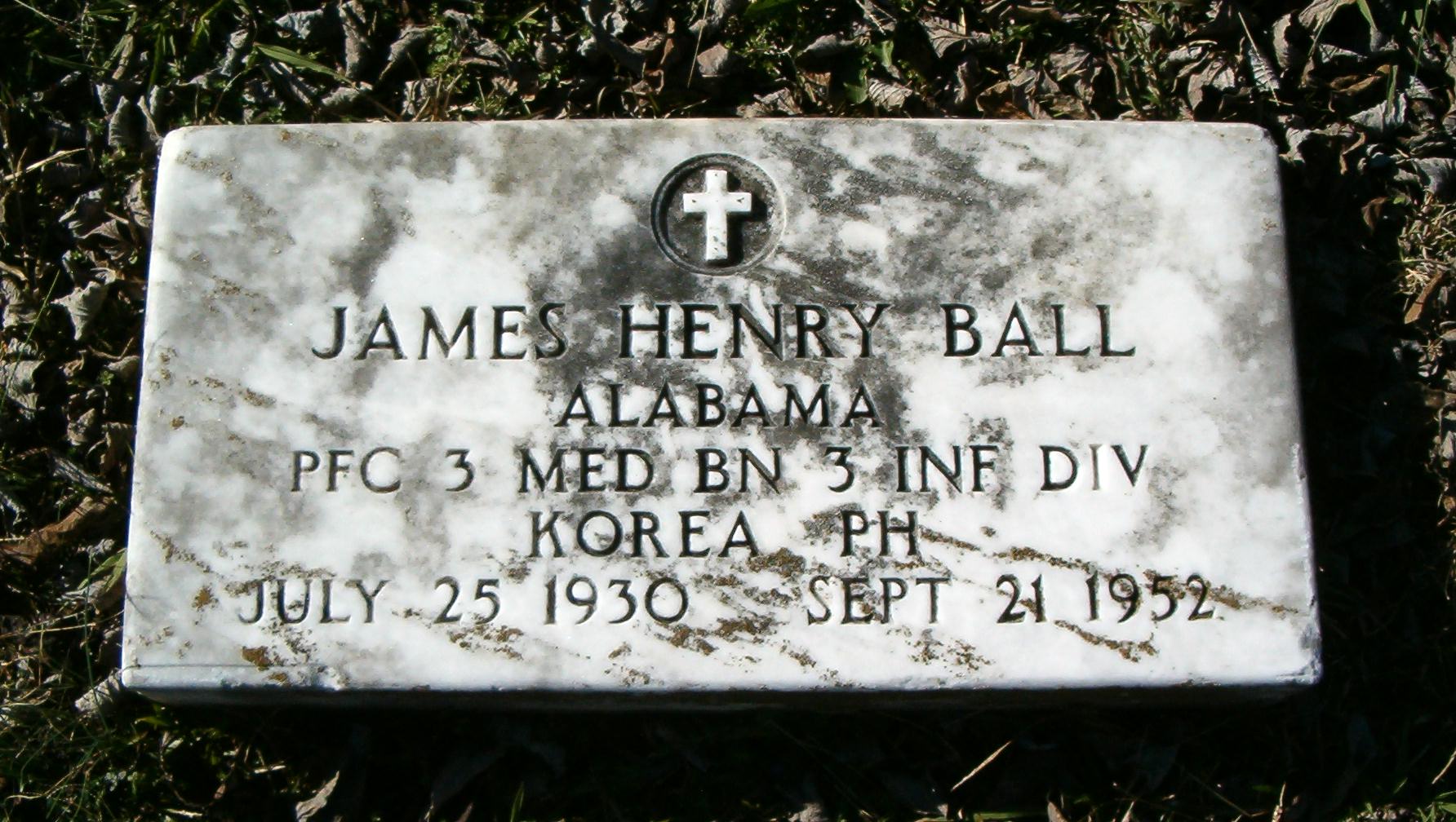 James Henry Ball was born on July 25, 1930, in Bessemer, Jefferson County, Alabama. He was the son of John Clark "Jack" Ball and Eula Mae Oakley Ball. He served in the 3rd Medical Battalion, 3rd Infantry Division, as a Private First Class and medic during the Korean War.