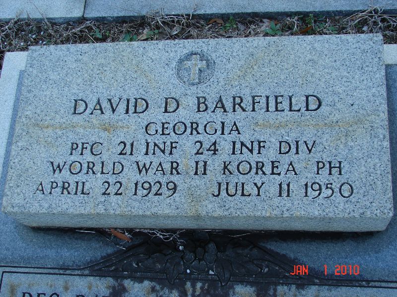PFC Barfield was Killed in Action on July 11, 1950, near Chochiwon, South Korea. He is now buried in the Eldorado Baptist Church Cemetery, Eldorado, Tift County, Georgia, USA.