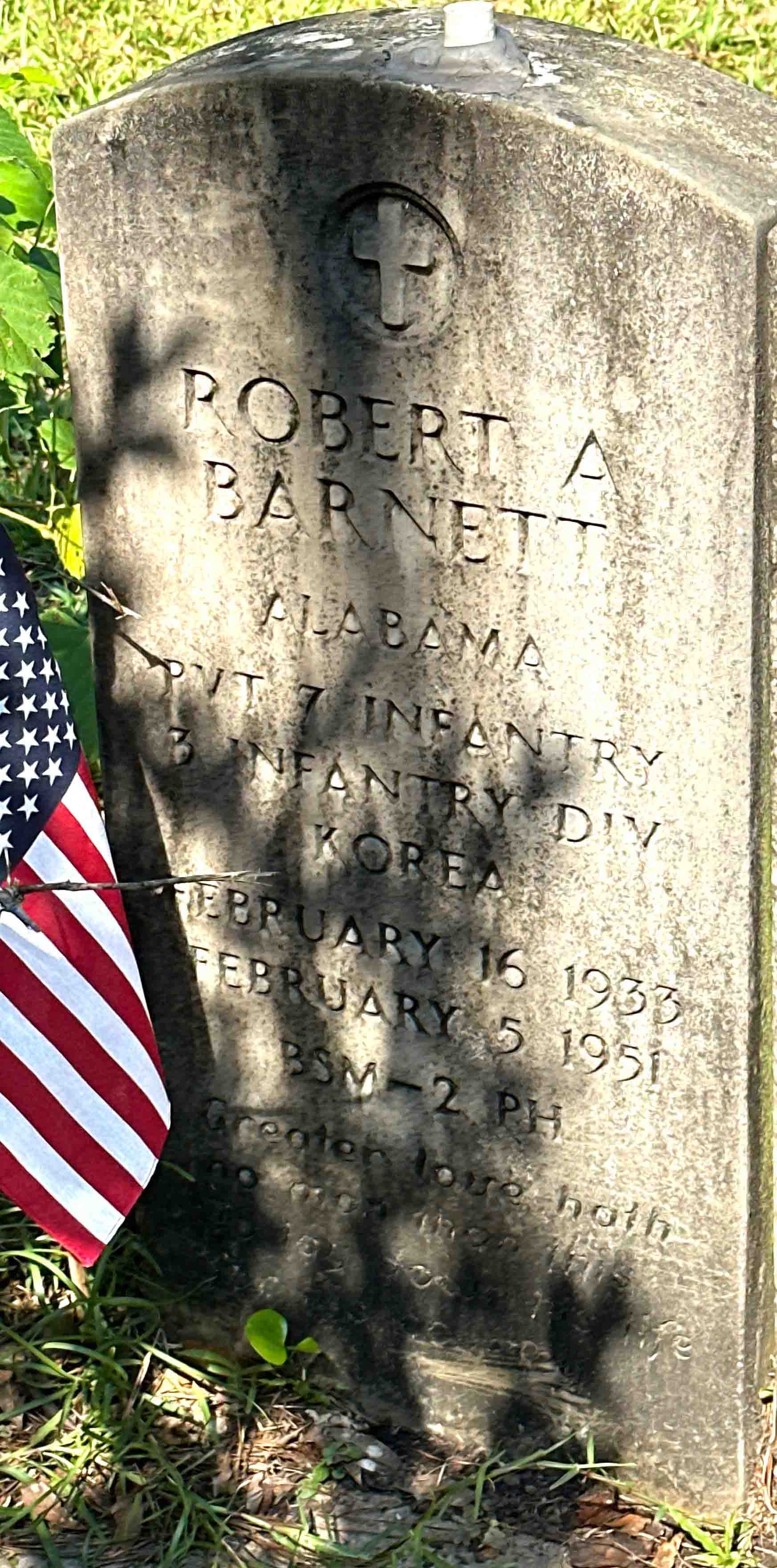 Robert Andrew Barnett was born on February 16, 1933, in Mount Vernon, Mobile County, Alabama. He was the son of Arnett Sidney Barnett and Flora Irene Oliver Barnett. He enlisted in the service on June 14, 1950. He served in the 7th Infantry Regiment, 3rd Infantry Division, as a Private First Class and Light Weapons Infantryman during the Korean War.