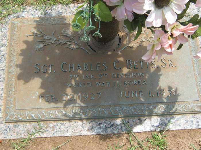 Charles Crew Betts Sr. was born on February 20, 1927, in Tuscaloosa County, Alabama. He was the son of William Robert Betts and Ida G. Plant Betts. He served in Company C, 1st Battalion, 7th Infantry Regiment, 3rd Infantry Division, as a Sergeant and Light Weapons Assault Crewman during the Korean War.