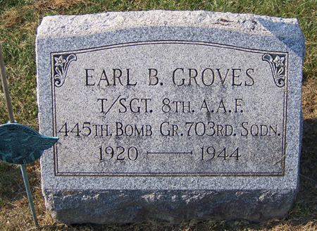 Earl Burton Groves was born on September 13, 1920, in Jefferson County, Pennsylvania. He was the son of William Earl Groves and Susan Elizabeth "Susie" Calhoun Groves. He enlisted in the service on November 9, 1942. He served in the 703rd Bomber Squadron, 445th Bomber Group, Heavy, as a Technical Sergeant and Radio Operator of B-24 #42-51532 nicknamed "Hot Rock" during World War II.