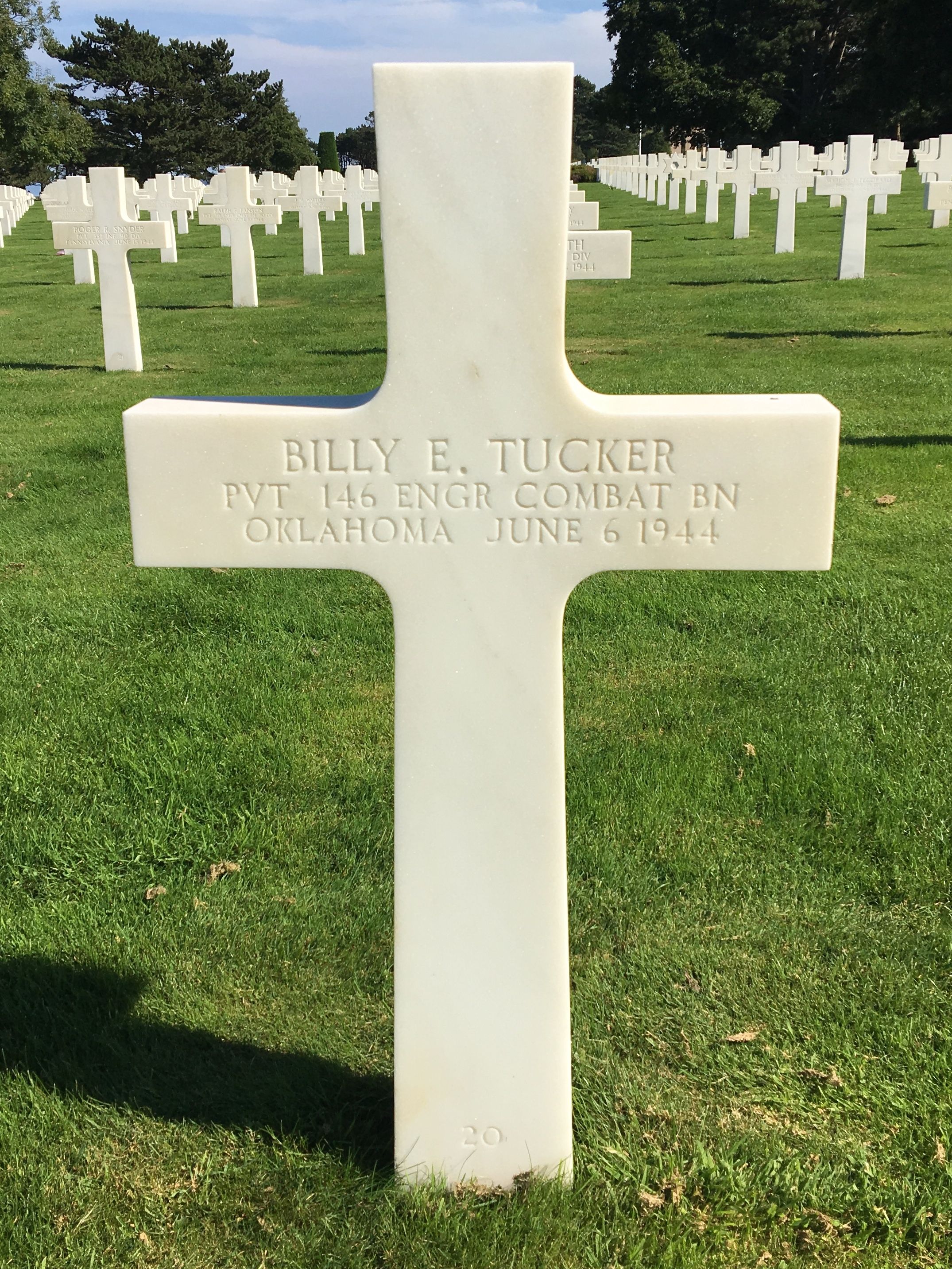 Born in Oklahoma on April 1, 1922. Served in the 146th Combat Engineer Battalion killed on Omaha Beach on June 6, 1944 (D-Day). He is buried next to his brother Major John Tucker who was killed several weeks later in France.