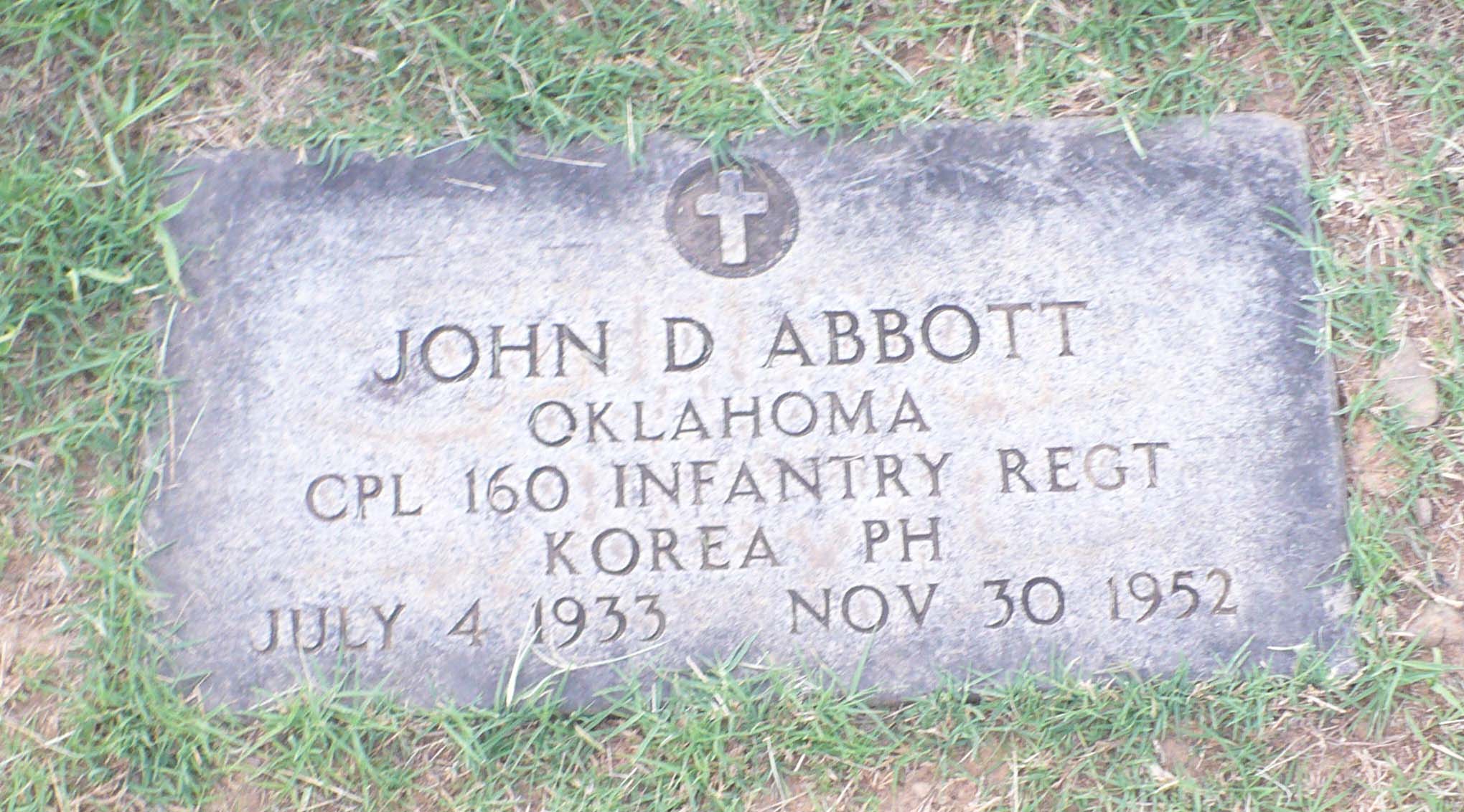 Cpl Abbott was Killed in Action on July 4, 1933, in North Korea. He is now buried in the Oakland Cemetery, Poteau, Le Flore County, Oklahoma, USA.