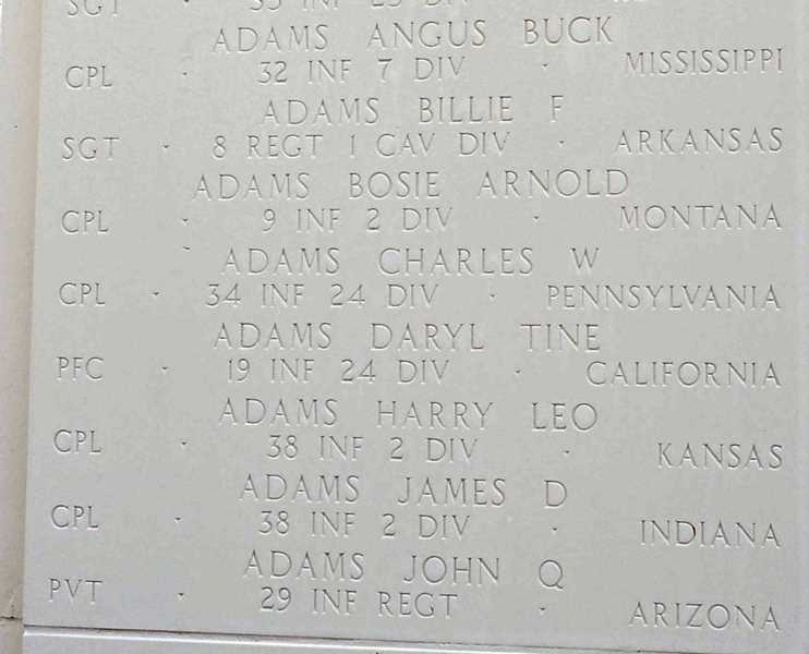 Pvt Adams was Killed in Action while fighting the enemy in the southwest section of the Pusan Perimeter near Hadong, South Korea, on July 27, 1950. His remains were not recovered. His name is inscribed on the Courts of the Missing at the Honolulu Memorial.