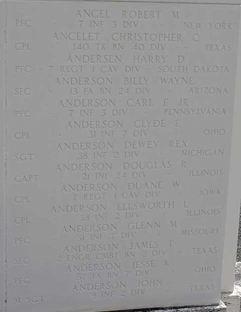 SFC Anderson was taken Prisoner of War while fighting the enemy in South Korea on January 1, 1951 and died while a prisoner on March 29, 1951. His remains were not recovered. His name is inscribed on the Courts of the Missing at the Honolulu Memorial.