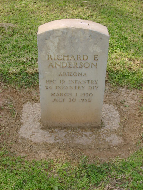 PFC Anderson was Killed in Action on July 20, 1950, in South Korea. He is now buried in the Greenwood Memory Lawn Cemetery, Phoenix, Maricopa County, Arizona, USA.