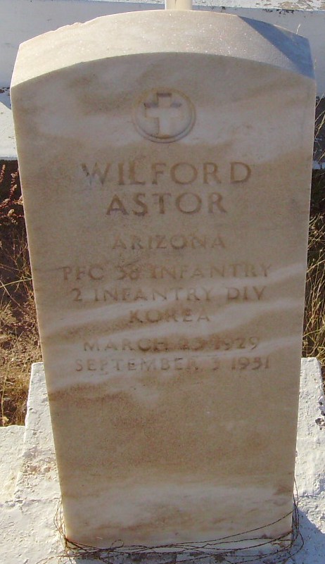 PFC Astor was Killed in Action on September 3, 1951, during the Battle of Bloody Ridge in North Korea. He is now buried in the San Carlos Cemetery, San Carlos, Gila County, Arizona, USA.