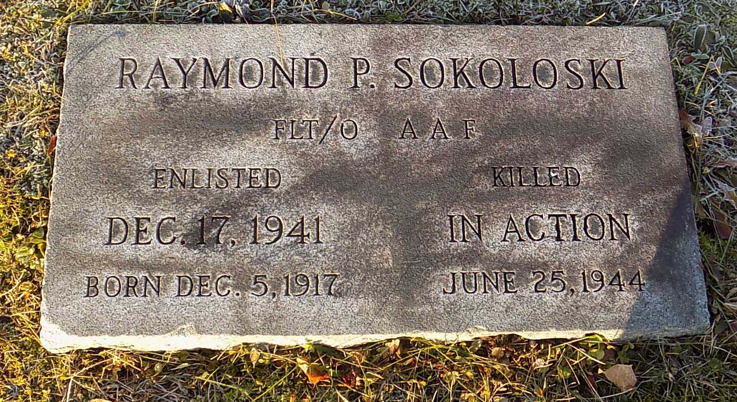 Raymond Peter Sokoloski was born on December 5, 1917, in Cleveland, Cuyahoga County, Ohio. He was the son of Joseph and Mary Sokoloski. He enlisted in the service on December 19, 1941. He served in the 844th Bomb Squadron, 489th Bomb Group, Heavy, as a Flight Officer and Navigator during World War II.