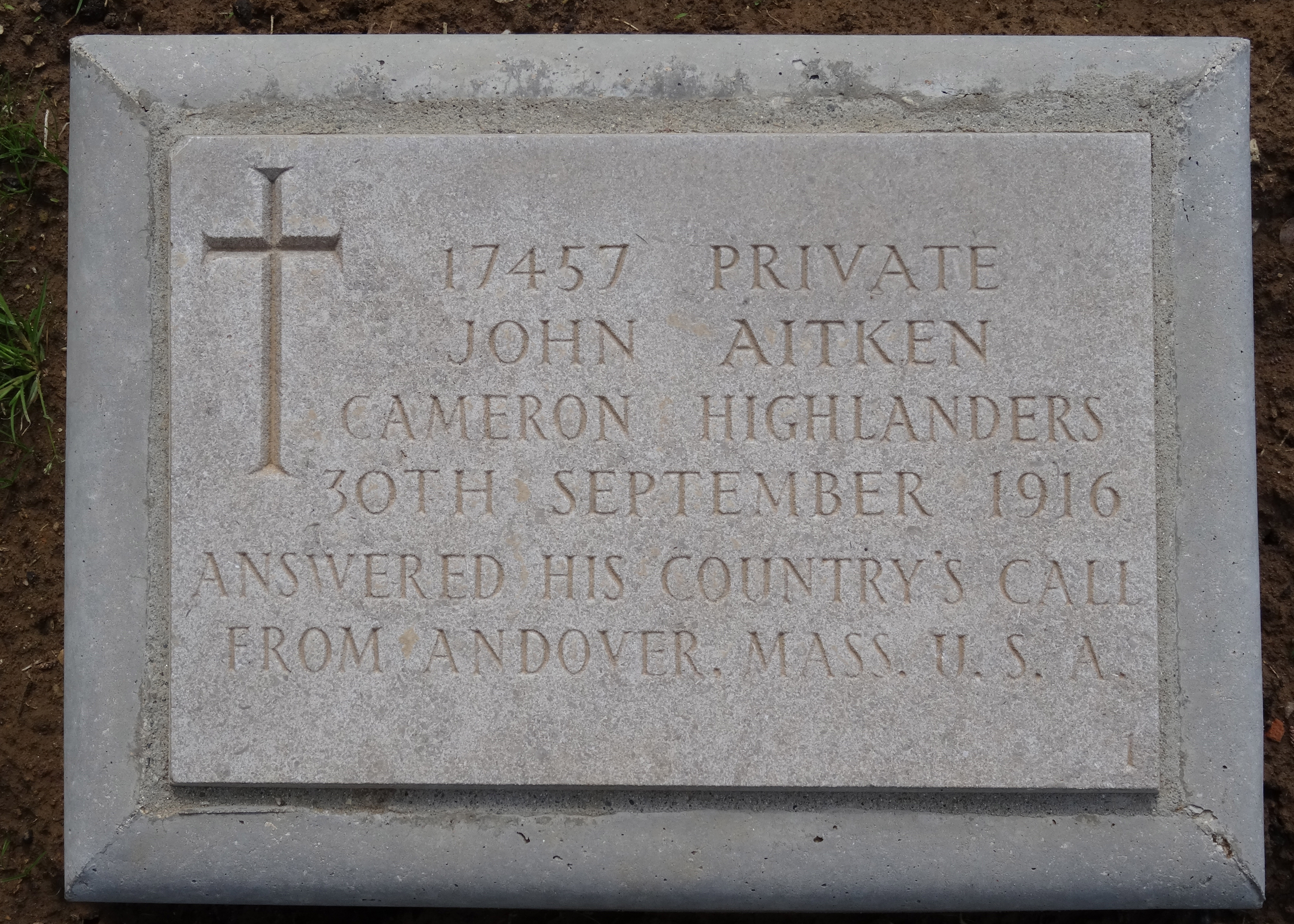 Born in 1890 in Dundee, Scotland. He immigrated to the US and when WW1 began, he returned to Scotland to serve in the Army. He was a Private in the 2nd Battalion of the Cameron Highlanders. He died while serving in Greece during the war on September 30, 1916. Son of Robert James and Mary Christie Aitken, of 50, Morris St., Paterson, New Jersey, U.S.A.