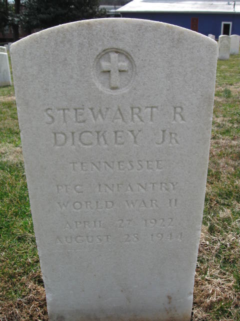 When Stewart R. Dickey, Jr. was born on August 27, 1922, in Tennessee, his father, Stewart, was 38 and his mother, Esta, was 33. He had one brother and three sisters. He served in the U.S. Army during World War II as a Private. He entered service in Tennessee. He died on August 28, 1944 during the invasion of southern France. He is now buried at Knoxville National Cemetery, Knoxville, Knox County, Tennessee, USA.