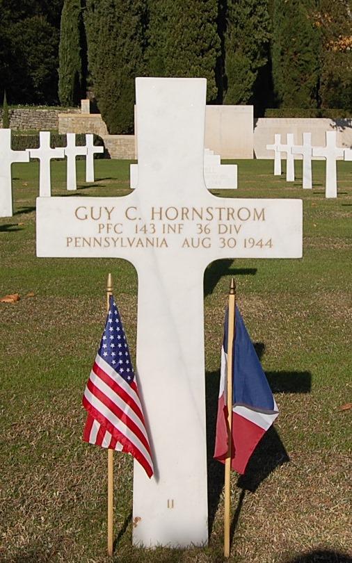 Guy C. Hornstrom served in the U.S. Army during World War II as a Private First Class in the 143rd Infantry Regiment, 36th Infantry Division. He entered service in Pennsylvania. He died on August 30, 1944 during the invasion of southern France. He is now buried at Rhone American Cemetery and Memorial, Draguignan, Departement du Var, Provence-Alpes-Côte d'Azur, France.