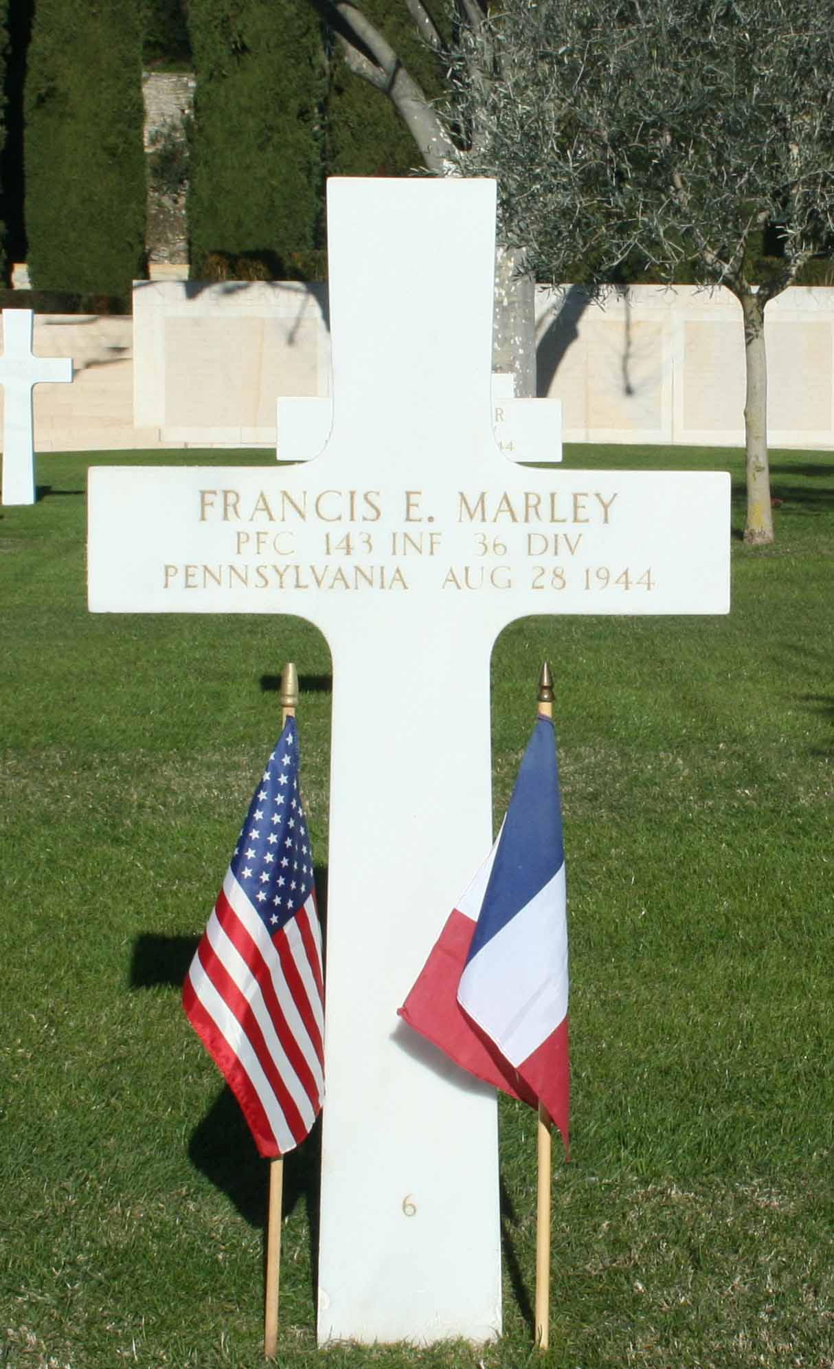 When Francis E. Marley was born in 1924 in Philadelphia, Pennsylvania, his father, James, was 34 and his mother, Helen, was 25. He had four brothers and six sisters. He served in the U.S. Army during World War II as a Private First Class in the 143rd Infantry Regiment, 36th Infantry Division. He entered service in Pennsylvania. He died on August 28, 1944 during the invasion of southern France. He is now buried at Rhone American Cemetery and Memorial, Draguignan, Departement du Var, Provence-Alpes-Côte d'Azur, France.
