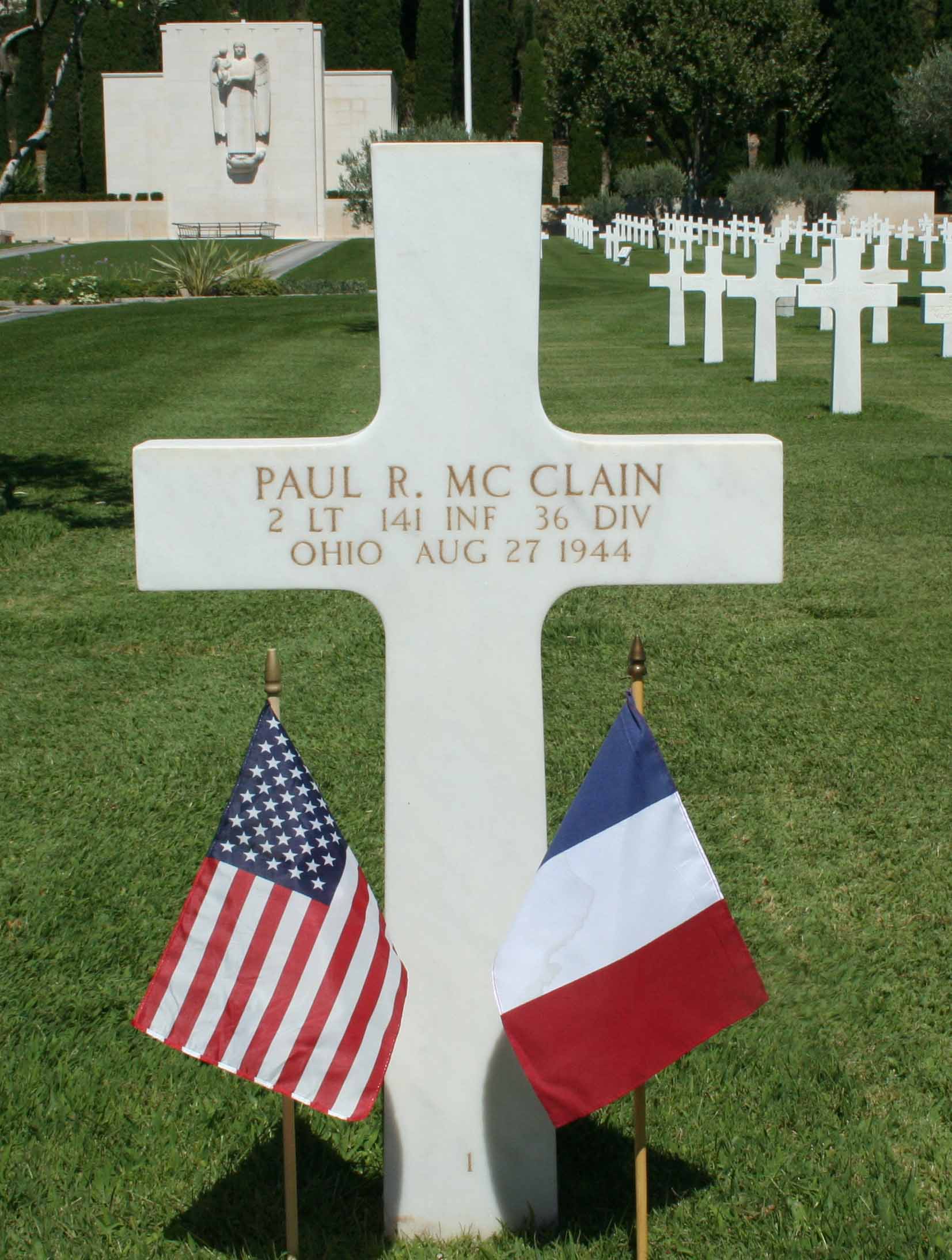 When Paul Raymond "Bill" McClain was born on August 29, 1913, in Toledo, Ohio, his father, Charles, was 38 and his mother, Mary, was 32. He married Alma Fern Karcher on May 22, 1937, in Indiana. They had one child during their marriage. served in the U.S. Army during World War II as a Second Lieutenant in the 141st Infantry Regiment, 36th Infantry Division. He entered service in Ohio. He died on August 27, 1944 during the invasion of southern France. He is now buried at Rhone American Cemetery and Memorial, Draguignan, Departement du Var, Provence-Alpes-Côte d'Azur, France.