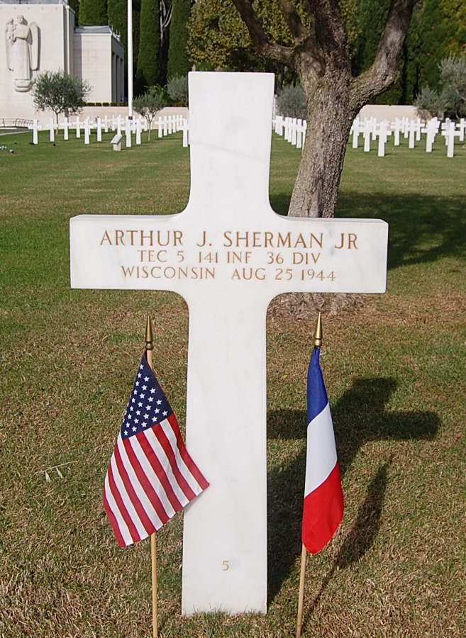 When Arthur J. Sherman, Jr. was born in 1925 in Wisconsin, his father, Arthur, was 46 and his mother, Clara, was 41. He had one brother and two sisters. He served in the U.S. Army during World War II as a Technician Fifth Grade in the 141st Infantry Regiment, 36th Infantry Division. He entered service in Wisconsin. He died on August 25, 1944 during the invasion of southern France. He is now buried at Rhone American Cemetery and Memorial, Draguignan, Departement du Var, Provence-Alpes-Côte d'Azur, France. He also has a marker in Oakwood Cemetery, Beaver Dam, Dodge County, Wisconsin, USA.