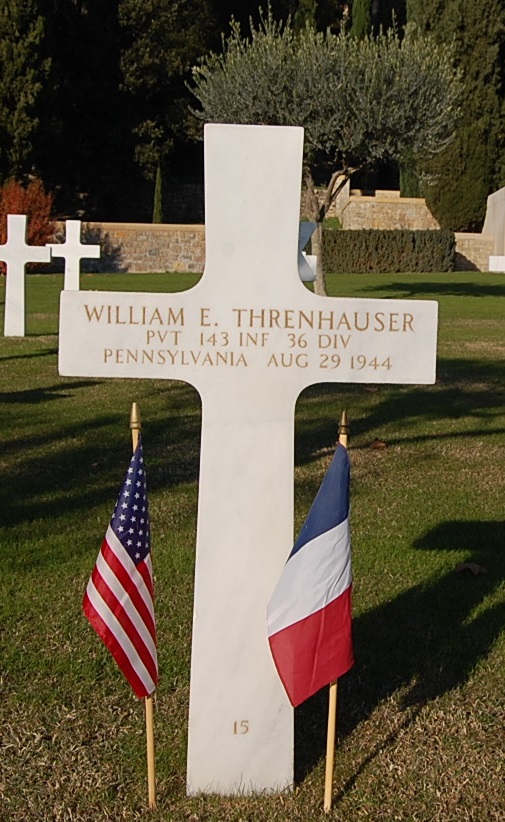 When William Edward Threnhauser was born on March 16, 1910, in Pittsburgh, Pennsylvania, his father, Edward, was 25 and his mother, Rose, was 25. He had one sister. He served in the U.S. Army during World War II as a Private in the 143rd Infantry Regiment, 36th Infantry Division. He entered service in Pennsylvania. He died on August 29, 1944 during the invasion of southern France. He is now buried at Rhone American Cemetery and Memorial, Draguignan, Departement du Var, Provence-Alpes-Côte d'Azur, France.
