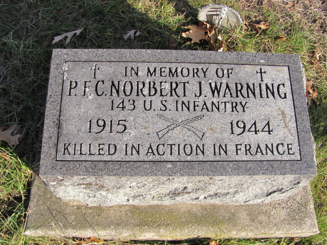 Norbert J. Warning was born on 1915. He served in the U.S. Army during World War II as a Private First Class in the 143rd Infantry Regiment, 36th Infantry Division. He entered service in Wisconsin. He died on August 26, 1944 during the invasion of southern France. He is now buried at Union Cemetery, Hortonville, Outagamie County, Wisconsin, USA.