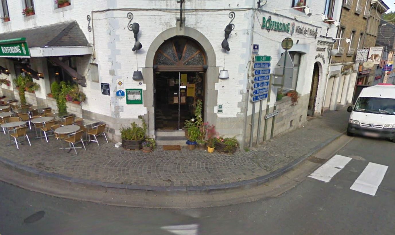 On the outside wall of the Hotel de l'abbaye, to the left of the front door as you are facing the hotel. The hotel sits at the corner of the N849 and rue Saint Gilles in the middle of town.