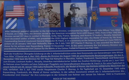 The site features a plaque honoring Lieutenant Audie Murphy and Captain Charles P. Murray Jr., both Medal of Honor recipients recognized for their extraordinary heroism during World War II. It also pays tribute to their service in the U.S. Army’s 3rd Infantry Division, the unit that liberated Salzburg, Austria, in May 1945 and subsequently served as the American occupation force.